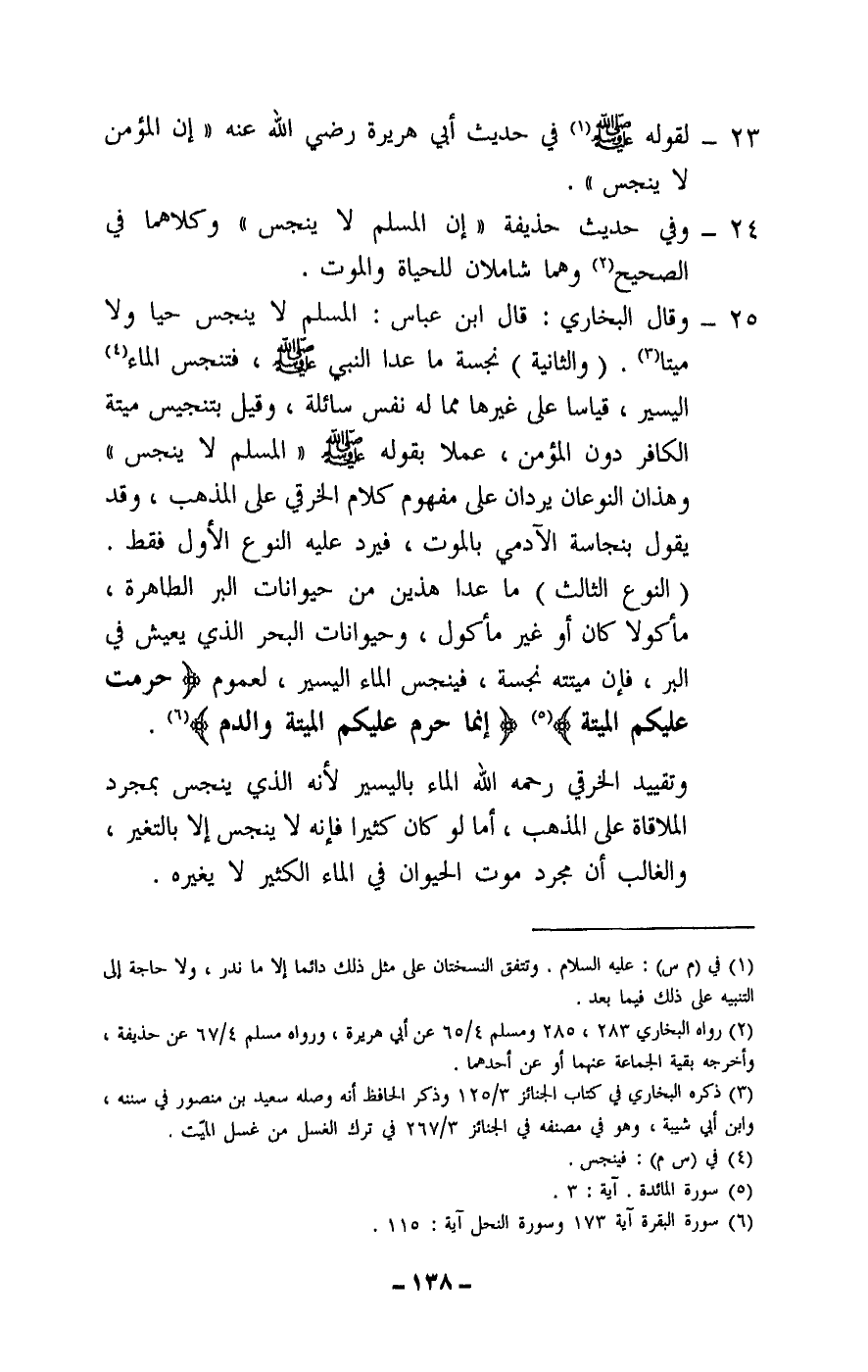 24 - وفي حديث حذيفة: «إن «المسلم لا ينجس» وكلاهما في الصحيح وهما شاملان للحياة والموت.