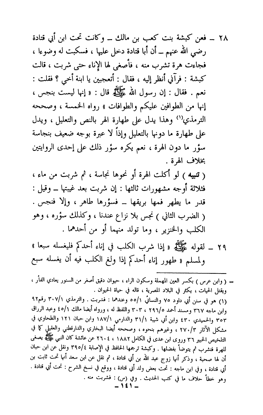 28 - «فعن كبشة بنت كعب بن مالك - وكانت تحت ابن أبي قتادة - رَضِيَ اللَّهُ عَنْهُمْ - أن أبا قتادة دخل عليها، فسكبت له وضوءا، فجاءت هرة تشرب منه، فأصغى لها الإناء حتى شربت، قالت كبشة: فرآني أنظر إليه، فقال: أتعجبين يا ابنة أخي؟ فقلت: نعم. فقال: إن رسول الله - صَلَّى اللَّهُ عَلَيْهِ وَسَلَّمَ - قال: «إنها ليست بنجس، إنها من الطوافين عليكم والطوافات» رواه الخمسة، وصححه الترمذي وهذا يدل على طهارة الهر بالنص والتعليل، ويدل على طهارة ما دونها بالتعليل وإذا لا عبرة بوجه ضعيف بنجاسة سؤر ما دون الهرة، نعم يكره سؤر ذلك على إحدى الروايتين بخلاف الهرة.