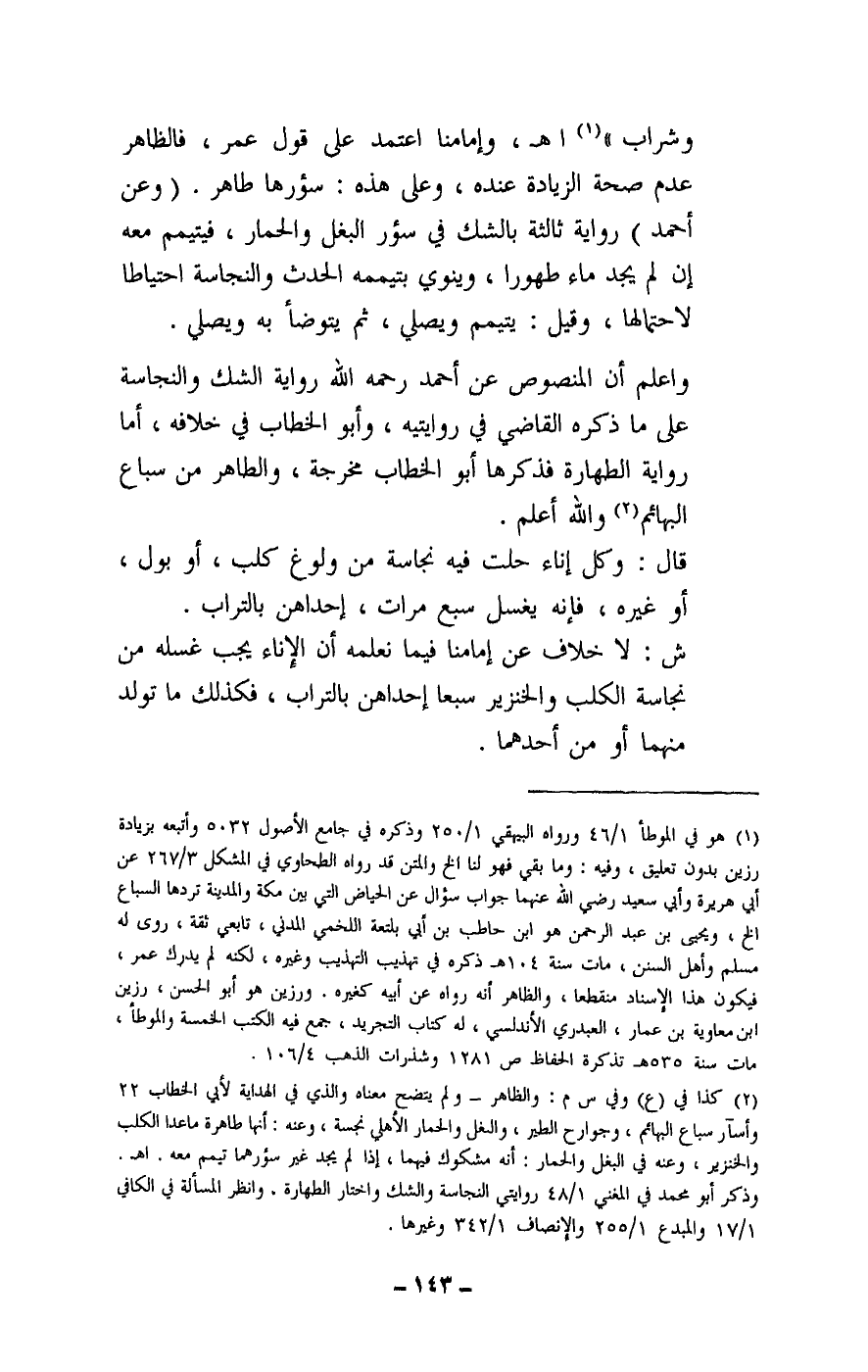 واعلم أن المنصوص عن أحمد - رَحِمَهُ اللَّهُ - رواية الشك والنجاسة على ما ذكره القاضي في روايتيه، وأبو الخطاب في خلافه، أما رواية الطهارة فذكرها أبو الخطاب مخرجة، والطاهر من سباع البهائم والله أعلم.