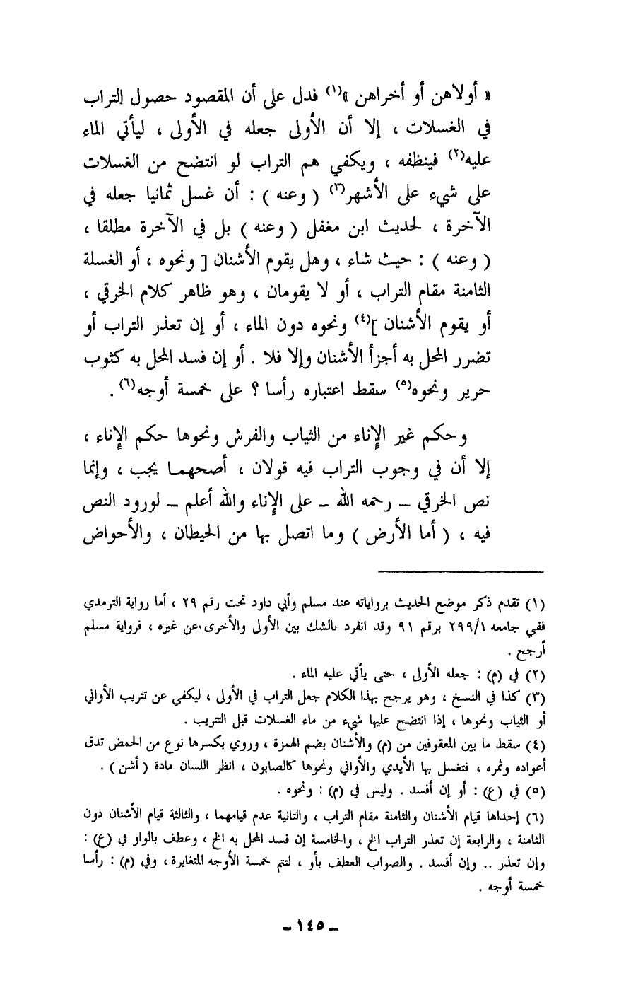 «أولاهن أو أخراهن» فدل على أن المقصود حصول التراب في الغسلات، إلا أن الأولى جعله في الأولى، ليأتي الماء عليه فينظفه، ويكفي هم التراب لو انتضح من الغسلات على شيء على الأشهر (وعنه) : أن غسل ثمانيا جعله في الآخرة، لحديث ابن مغفل (وعنه) بل في الآخرة مطلقا، (وعنه) : حيث شاء، وهل يقوم الأشنان [ونحوه، أو الغسلة الثامنة مقام التراب، أو لا يقومان، وهو ظاهر كلام الخرقي، أو يقوم الأشنان] ونحوه دون الماء، أو إن تعذر التراب أو تضرر المحل به أجزأ الأشنان وإلا فلا. أو إن فسد المحل به كثوب حرير ونحوه سقط اعتباره رأسا، على خمسة أوجه.