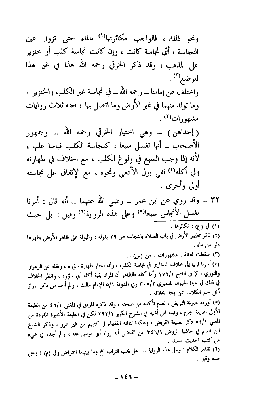 32 - وقد روي عن ابن عمر - رَضِيَ اللَّهُ عَنْهُمَا - أنه قال: «أمرنا بغسل الأنجاس سبعا» وعلى هذه الرواية وقيل: بل حيث