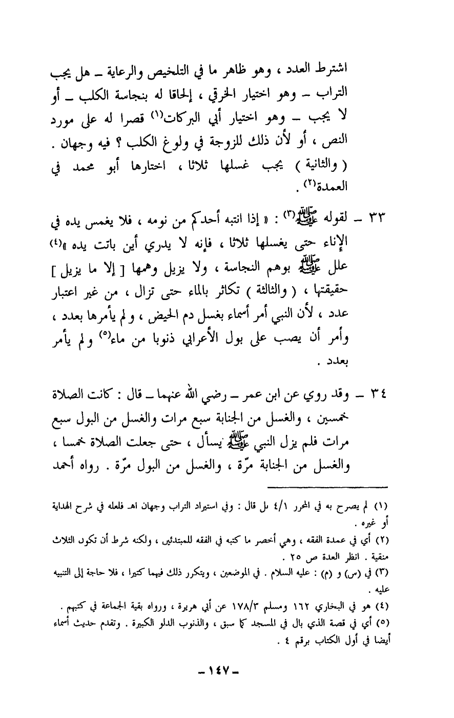 34 - وقد روى عن ابن عمر - رَضِيَ اللَّهُ عَنْهُمَا - قال: «كانت الصلاة خمسين، والغسل من الجنابة سبع مرات والغسل من البول سبع مرات فلم يزل النبي - صَلَّى اللَّهُ عَلَيْهِ وَسَلَّمَ - يسأل، حتى جعلت الصلاة خمسا، والغسل من الجنابة مرة، والغسل من البول مرة» . رواه أحمد
