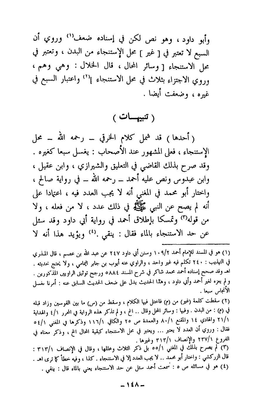 (أحدها) قد شمل كلام الخرقي - رَحِمَهُ اللَّهُ - محل الاستنجاء، فعلى المشهور عند الأصحاب: يغسل سبعا كغيره. وقد صرح بذلك القاضي في التعليق والشيرازي، وابن عقيل، وابن عبدوس ونص عليه أحمد - رَحِمَهُ اللَّهُ - في رواية صالح، واختار أبو محمد في المغني أنه لا يجب العدد فيه، اعتمادا على أنه لم يصح عن النبي - صَلَّى اللَّهُ عَلَيْهِ وَسَلَّمَ - في ذلك عدد، لا من فعله، ولا من قوله وتمسكا بإطلاق أحمد في رواية أبي داود وقد سئل عن حد الاستنجاء بالماء فقال: ينقي. ويؤيد هذا أنه لا