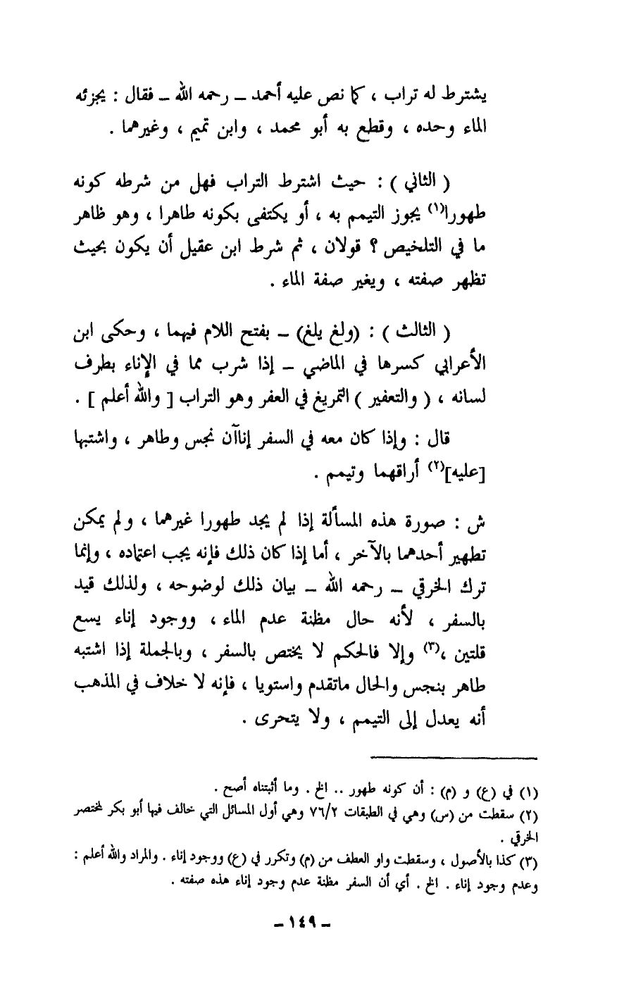 (الثاني) : حيث اشترط التراب فهل من شرطه كونه طهورا يجوز التيمم به، أو يكتفى بكونه طاهرا، وهو ظاهر ما في التلخيص، قولان، ثم شرط ابن عقيل أن يكون بحيث تظهر صفته، ويغير صفة الماء.