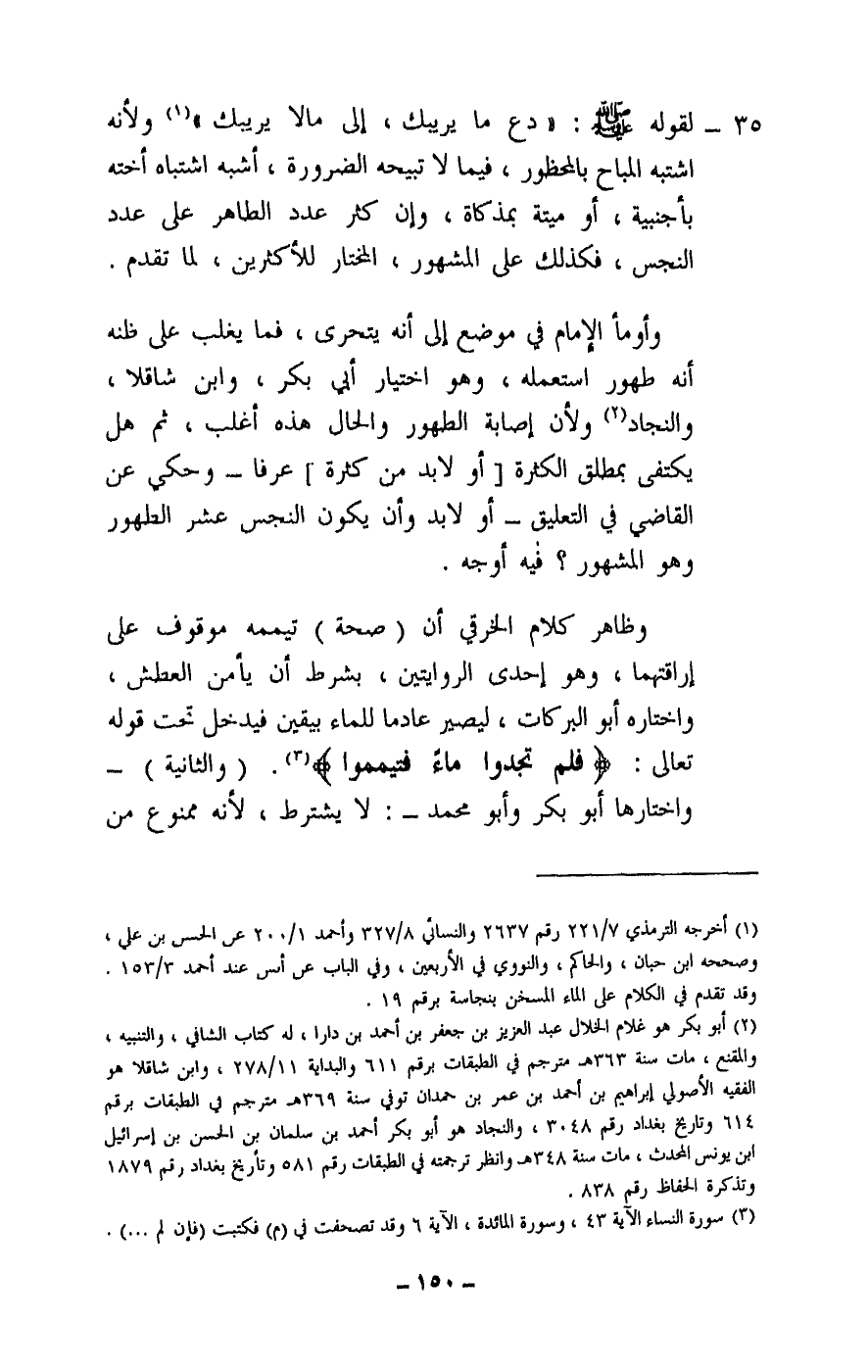 35 - لقوله: - صَلَّى اللَّهُ عَلَيْهِ وَسَلَّمَ - «دع ما يريبك، إلى ما لا يريبك» ولأنه اشتبه المباح بالمحظور، فيما لا تبيحه الضرورة، أشبه اشتباه أخته بأجنبية، أو ميتة بمذكاة، وإن كثر عدد الطاهر على عدد النجس، فكذلك على المشهور، المختار للأكثرين، لما تقدم.