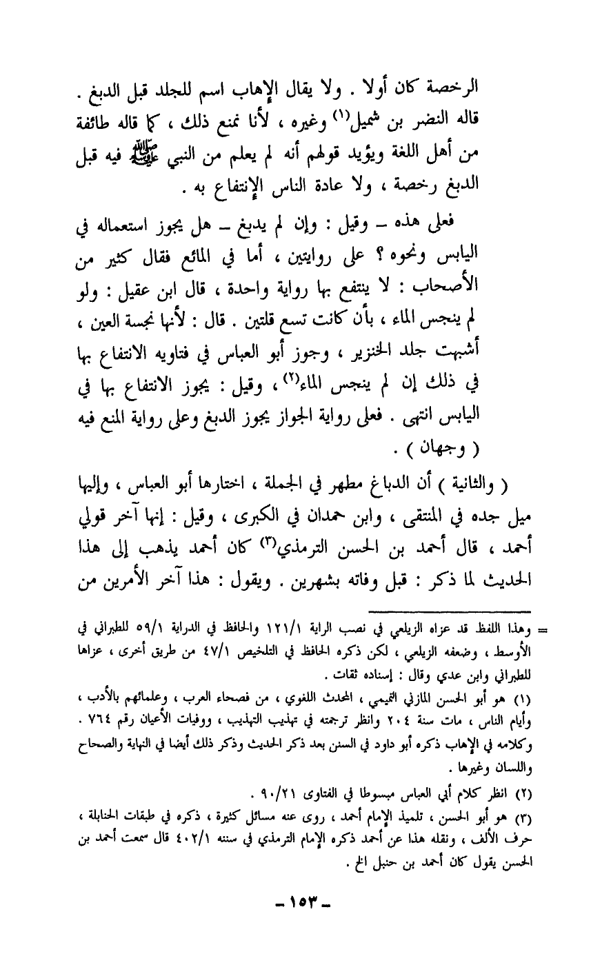(والثانية) أن الدباغ مطهر في الجملة، اختارها أبو العباس، وإليها ميل جده في المنتقى، وابن حمدان في الكبرى، وقيل: إنها آخر قولي أحمد، قال أحمد بن الحسن الترمذي كان أحمد يذهب إلى هذا الحديث لما ذكر: قبل وفاته بشهرين. ويقول: هذا آخر الأمرين من