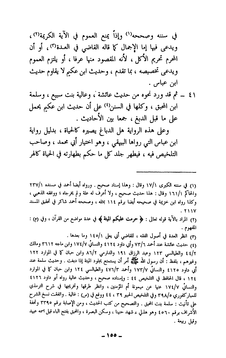 41 - ثم قد ورد نحوه من حديث عائشة، وعالية بنت سبيع، وسلمة بن المحبق، وكلها في السنن على أن حديث ابن عكيم يحمل على ما قبل الدبغ، جمعا بين الأحاديث.
