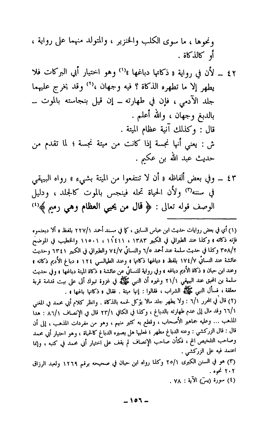 43 - وفي بعض ألفاظه: «أن «لا تنتفعوا من الميتة بشيء» رواه البيهقي في سننه، ولأن الحياة تحله فينجس بالموت كالجلد، ودليل الوصف قَوْله تَعَالَى: {قَالَ مَنْ يُحْيِي الْعِظَامَ وَهِيَ رَمِيمٌ} [يس: 78]
