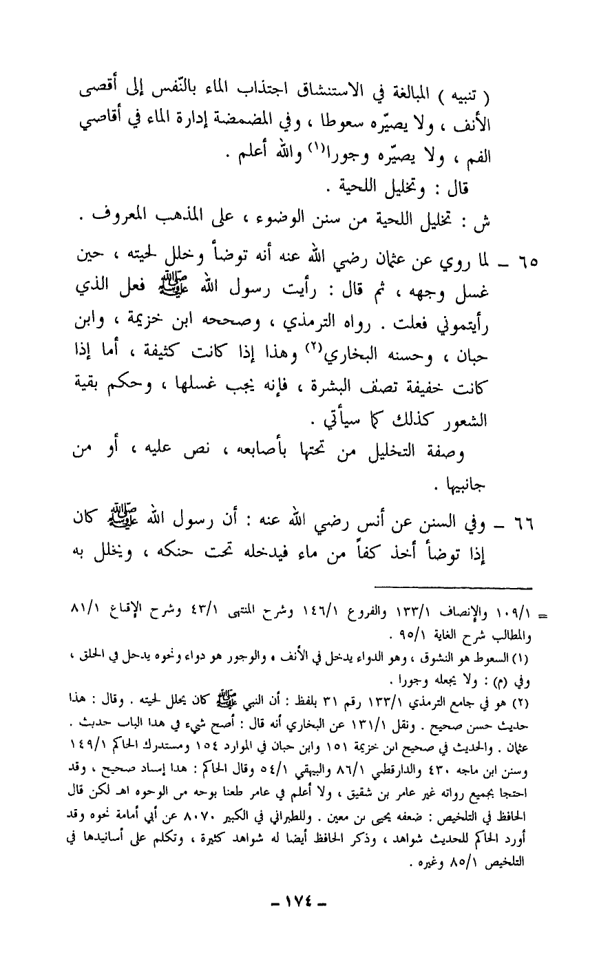 65 - لما «روي عن عثمان - رَضِيَ اللَّهُ عَنْهُ - أنه توضأ وخلل لحيته، حين غسل وجهه، ثم قال: رأيت رسول الله - صَلَّى اللَّهُ عَلَيْهِ وَسَلَّمَ - فعل الذي رأيتموني فعلت» . رواه الترمذي، وصححه ابن خزيمة، وابن حبان، وحسنه البخاري وهذا إذا كانت كثيفة، أما إذا كانت خفيفة تصف البشرة، فإنه يجب غسلها، وحكم بقية الشعور كذلك كما سيأتي.