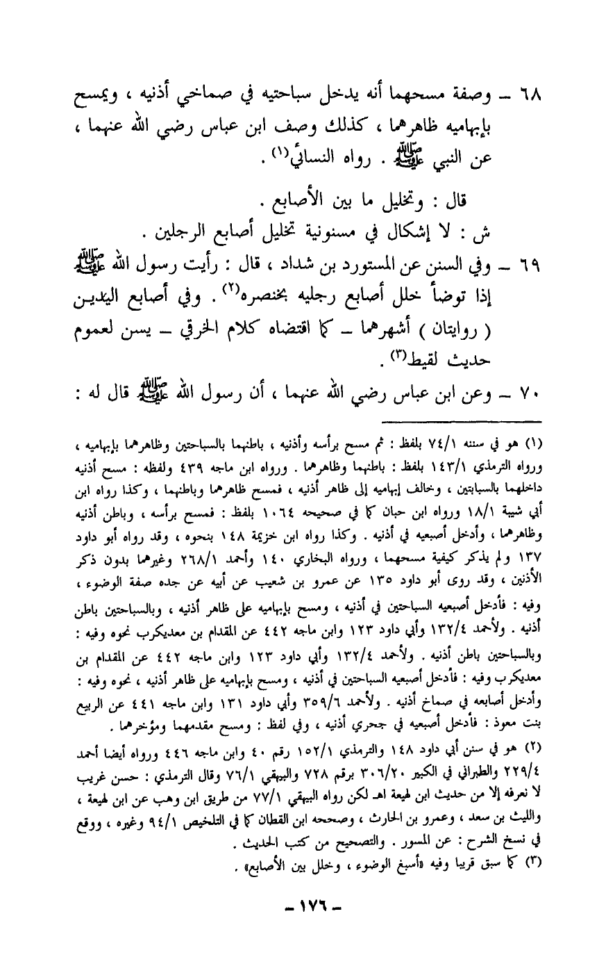 68 - وصفة مسحهما أنه يدخل سباحتيه في صماخي أذنيه، ويمسح بإبهاميه ظاهرهما، كذلك وصف ابن عباس - رَضِيَ اللَّهُ عَنْهُمَا - عن النبي - صَلَّى اللَّهُ عَلَيْهِ وَسَلَّمَ -. رواه النسائي.