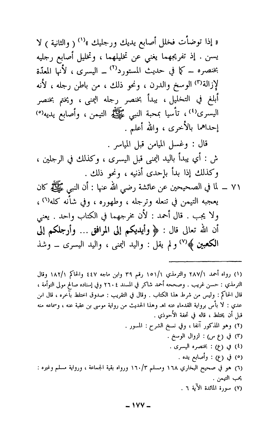 71 - لما في الصحيحين عن عائشة - رَضِيَ اللَّهُ عَنْهَا -: «أن النبي - صَلَّى اللَّهُ عَلَيْهِ وَسَلَّمَ - كان يعجبه التيمن في تنعله وترجله، وطهوره، وفي شأنه كله» ، ولا يجب. قال أحمد: لأن مخرجهما في الكتاب واحد. يعني أن الله تعالى قال: {وَأَيْدِيَكُمْ إِلَى الْمَرَافِقِ وَامْسَحُوا بِرُءُوسِكُمْ وَأَرْجُلَكُمْ} [المائدة: 6] ولم يقل: واليد اليمنى، واليد اليسرى - وشذ