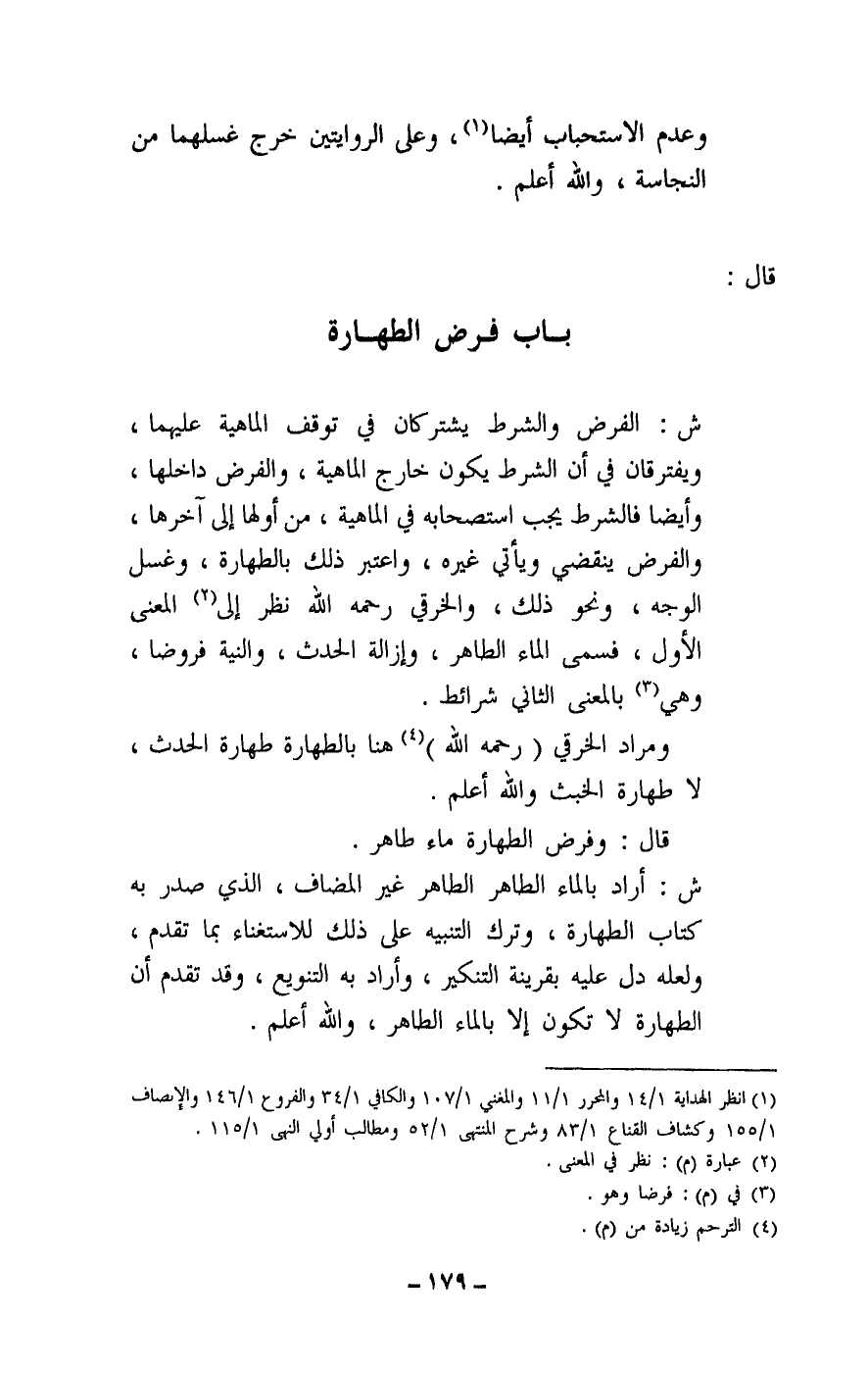 ش: الفرض والشرط يشتركان في توقف الماهية عليهما، ويفترقان في أن الشرط يكون خارج الماهية، والفرض داخلها، وأيضا فالشرط يجب استصحابه في الماهية، من أولها إلى آخرها، والفرض ينقضي ويأتي غيره، واعتبر ذلك بالطهارة، وغسل الوجه، ونحو ذلك، والخرقي - رَحِمَهُ اللَّهُ - نظر إلى المعنى الأول، فسمى الماء الطاهر، وإزالة الحدث، والنية فروضا، وهي بالمعنى الثاني شرائط.