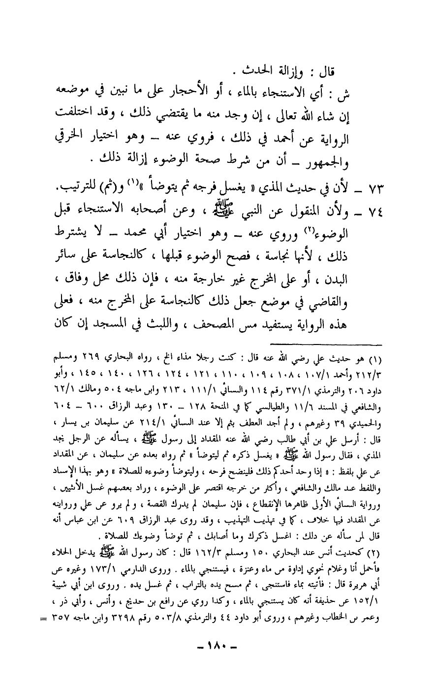 73 - لأن في حديث المذي: «يغسل فرجه ثم يتوضأ» و (ثم) للترتيب.