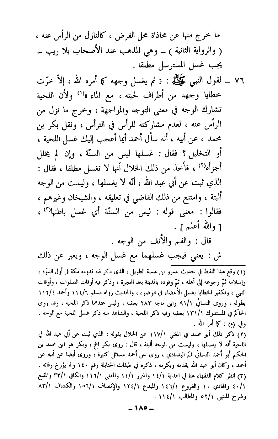 76 - لقول النبي - صَلَّى اللَّهُ عَلَيْهِ وَسَلَّمَ -: «ثم يغسل وجهه كما أمره الله، إلا خرت خطايا وجهه من أطراف لحيته، مع الماء» ولأن اللحية تشارك الوجه في معنى التوجه والمواجهة، وخرج ما نزل من الرأس عنه، لعدم مشاركته للرأس في الترأس، ونقل بكر بن محمد، عن أبيه، أنه سأل أحمد أيما أعجب إليك غسل اللحية، أو التخليل؟ فقال: غسلها ليس من السنة، وإن لم يخلل أجزأه، فأخذ من ذلك الخلال أنها لا تغسل مطلقا، فقال: الذي ثبت عن أبي عبد الله، أنه لا يغسلها، وليست من الوجه البتة، وامتنع من ذلك القاضي في تعليقه، والشيخان وغيرهم، فقالوا: معنى قوله: ليس من السنة أي غسل باطنها، [والله أعلم] .