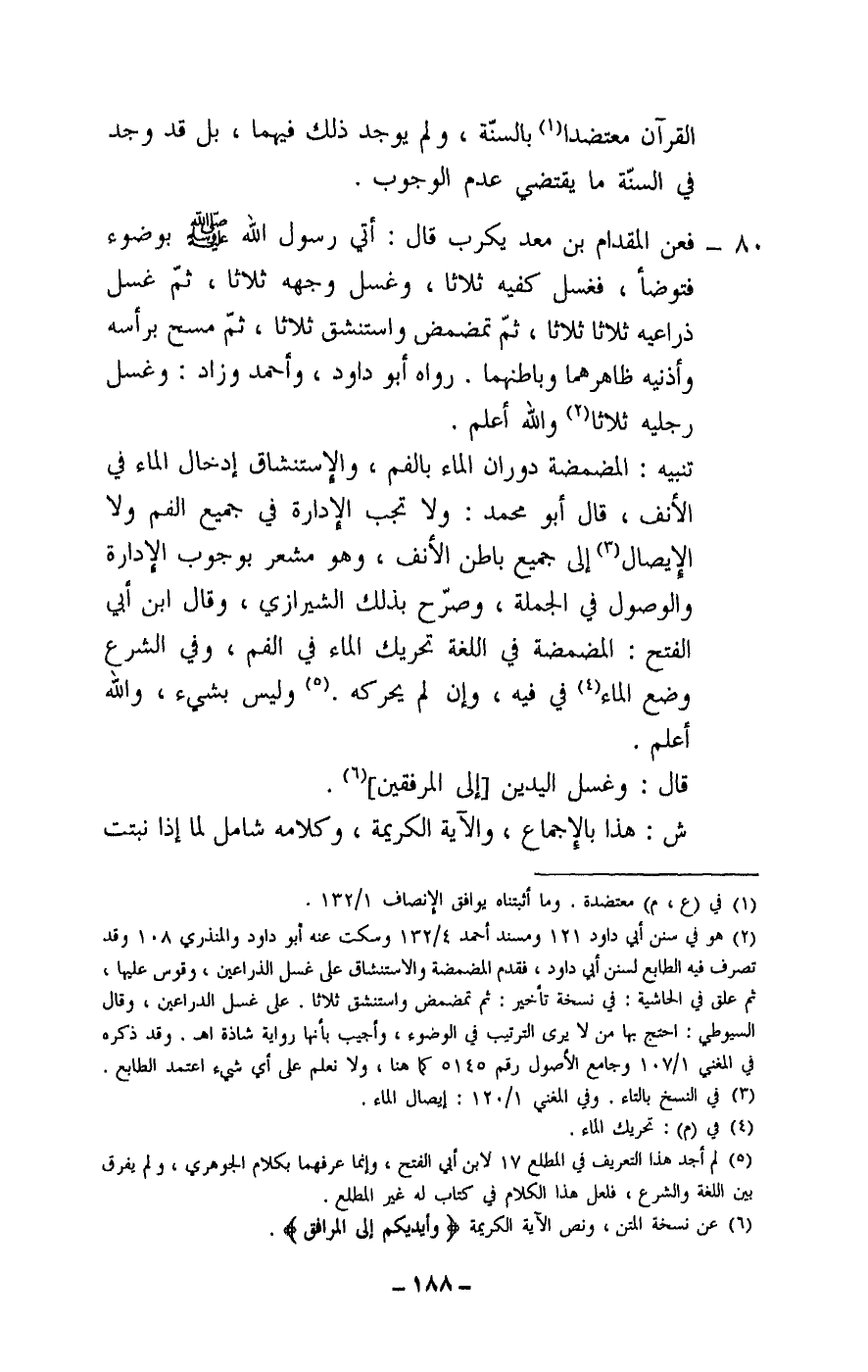 80 - فعن المقدام بن معد يكرب قال: «أتي رسول الله - صَلَّى اللَّهُ عَلَيْهِ وَسَلَّمَ - بوضوء فتوضأ، فغسل كفيه ثلاثا، وغسل وجهه ثلاثا، ثم غسل ذراعيه ثلاثا ثلاثا، ثم تمضمض واستنشق ثلاثا، ثم مسح برأسه وأذنيه ظاهرهما وباطنهما» . رواه أبو داود، وأحمد وزاد: «وغسل رجليه ثلاثا» والله أعلم.