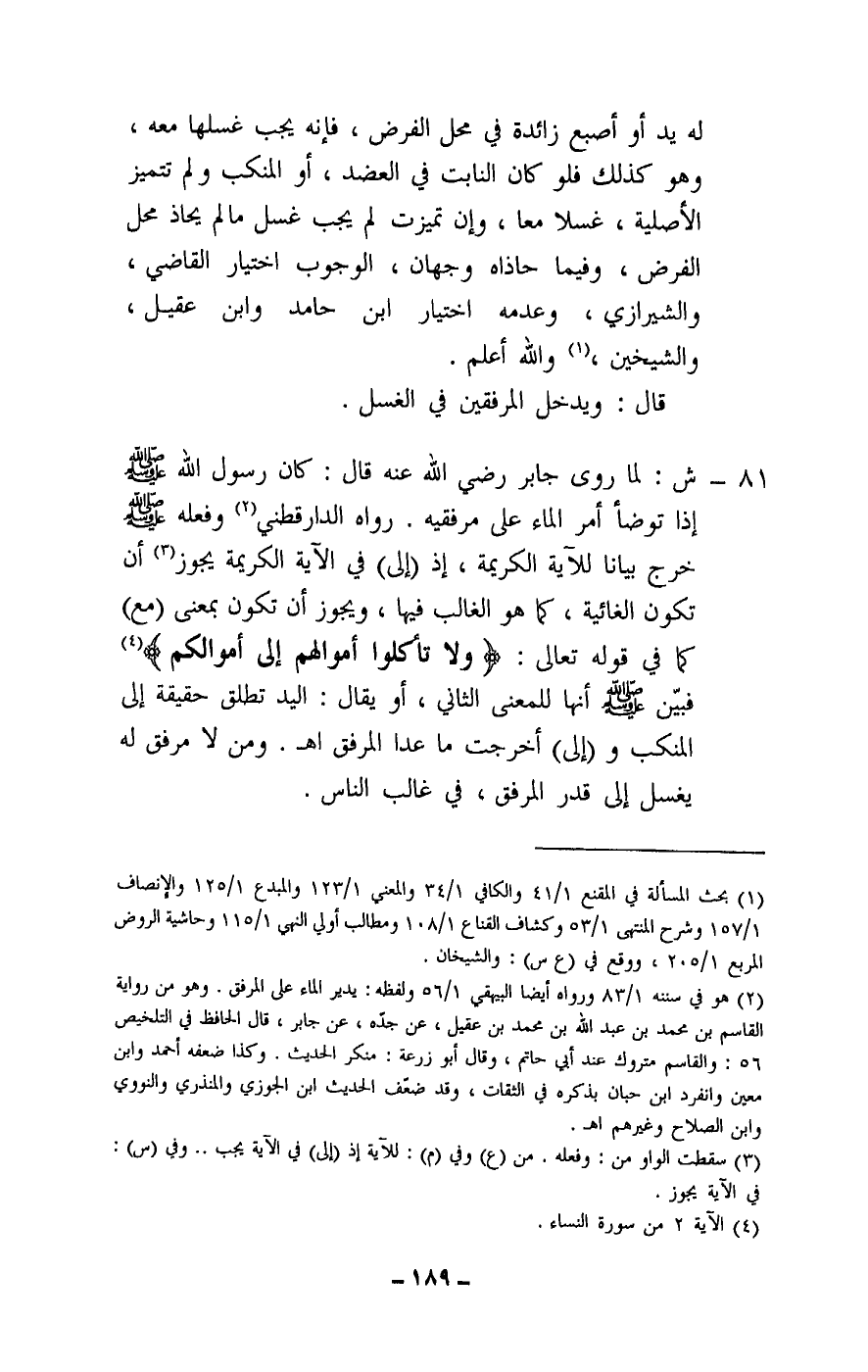 81 - ش: لما روى جابر - رَضِيَ اللَّهُ عَنْهُ - قال: «كان رسول الله - صَلَّى اللَّهُ عَلَيْهِ وَسَلَّمَ - إذا توضأ أمر الماء على مرفقيه» . رواه الدارقطني وفعله - صَلَّى اللَّهُ عَلَيْهِ وَسَلَّمَ - خرج بيانا للآية الكريمة، إذ (إلى) في الآية الكريمة يجوز أن تكون الغائية، كما هو الغالب فيها، ويجوز أن تكون بمعنى (مع) كما في قَوْله تَعَالَى: {وَلَا تَأْكُلُوا أَمْوَالَهُمْ إِلَى أَمْوَالِكُمْ} [النساء: 2] فبين - صَلَّى اللَّهُ عَلَيْهِ وَسَلَّمَ - أنها للمعنى الثاني، أو يقال: اليد تطلق حقيقة إلى المنكب و (إلى) أخرجت ما عدا المرفق اهـ. ومن لا مرفق له يغسل إلى قدر المرفق، في غالب الناس.