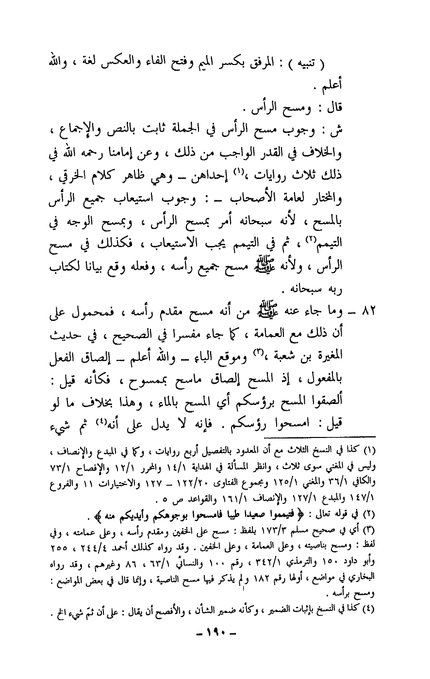 ش: وجوب مسح الرأس في الجملة ثابت بالنص والإجماع، والخلاف في القدر الواجب من ذلك، وعن إمامنا - رَحِمَهُ اللَّهُ - في ذلك ثلاث روايات، إحداهن - وهي ظاهر كلام الخرقي، والمختار لعامة الأصحاب -: وجوب استيعاب جميع الرأس بالمسح، لأنه سبحانه أمر بمسح الرأس، وبمسح الوجه في التيمم، ثم في التيمم يجب الاستيعاب، فكذلك في مسح الرأس، ولأنه - صَلَّى اللَّهُ عَلَيْهِ وَسَلَّمَ - مسح جميع رأسه، وفعله وقع بيانا لكتاب ربه سبحانه.