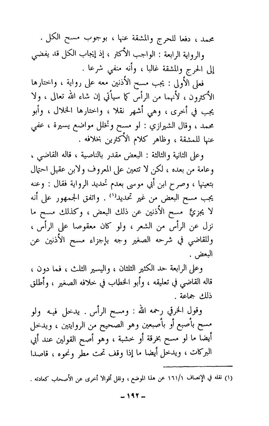 واتفق الجمهور على أنه لا يجزئ مسح الأذنين عن ذلك البعض، وكذلك مسح ما نزل عن الرأس من الشعر، ولو كان معقوصا على الرأس، وللقاضي في شرحه الصغير وجه بإجزاء مسح الأذنين عن البعض.