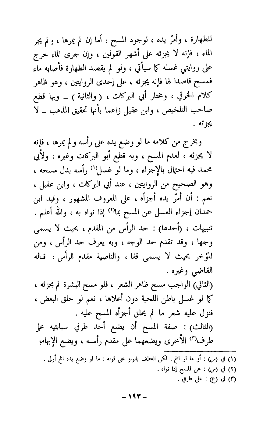 تنبيهات (أحدها) : حد الرأس من المقدم، بحيث لا يسمى وجها، وقد تقدم حد الوجه، وبه يعرف حد الرأس، ومن المؤخر بحيث لا يسمى قفا، والناصية مقدم الرأس، قاله القاضي وغيره.