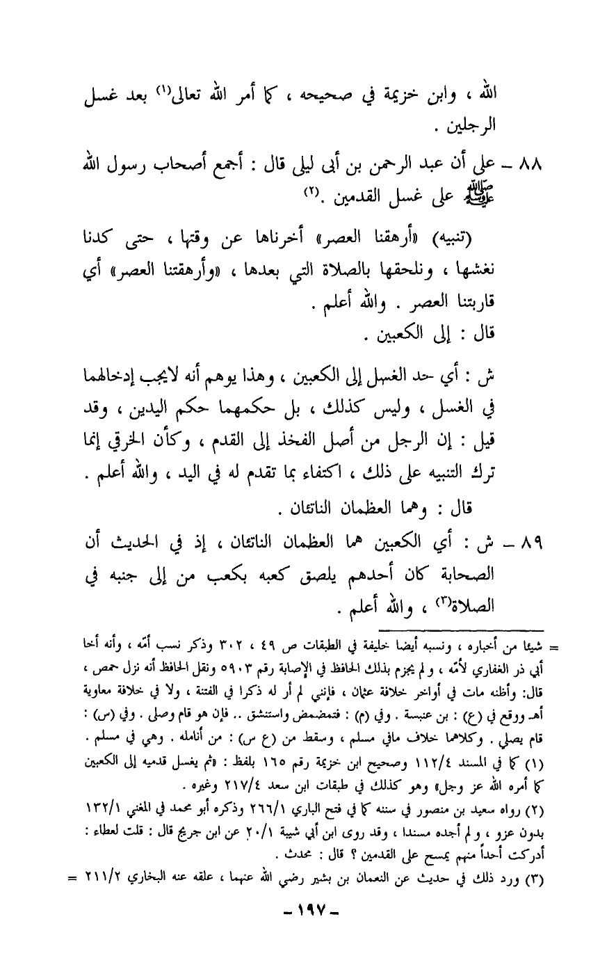 88 - على أن عبد الرحمن بن أبي ليلى قال: أجمع أصحاب رسول الله - صَلَّى اللَّهُ عَلَيْهِ وَسَلَّمَ - على غسل القدمين.