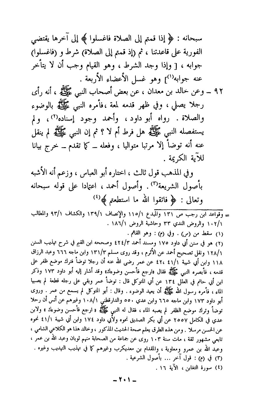 92 - وعن خالد بن معدان، عن بعض أصحاب النبي - صَلَّى اللَّهُ عَلَيْهِ وَسَلَّمَ - «أنه رأى رجلا يصلي، وفي ظهر قدمه لمعة، فأمره النبي - صَلَّى اللَّهُ عَلَيْهِ وَسَلَّمَ - بالوضوء والصلاة» . رواه أبو داود، وأحمد وجود إسناده، ولم يستفصله النبي - صَلَّى اللَّهُ عَلَيْهِ وَسَلَّمَ - هل فرط أم لا؟ ثم إن النبي - صَلَّى اللَّهُ عَلَيْهِ وَسَلَّمَ - لم ينقل عنه أنه توضأ إلا مرتبا متواليا، وفعله - كما تقدم - خرج بيانا للآية الكريمة.