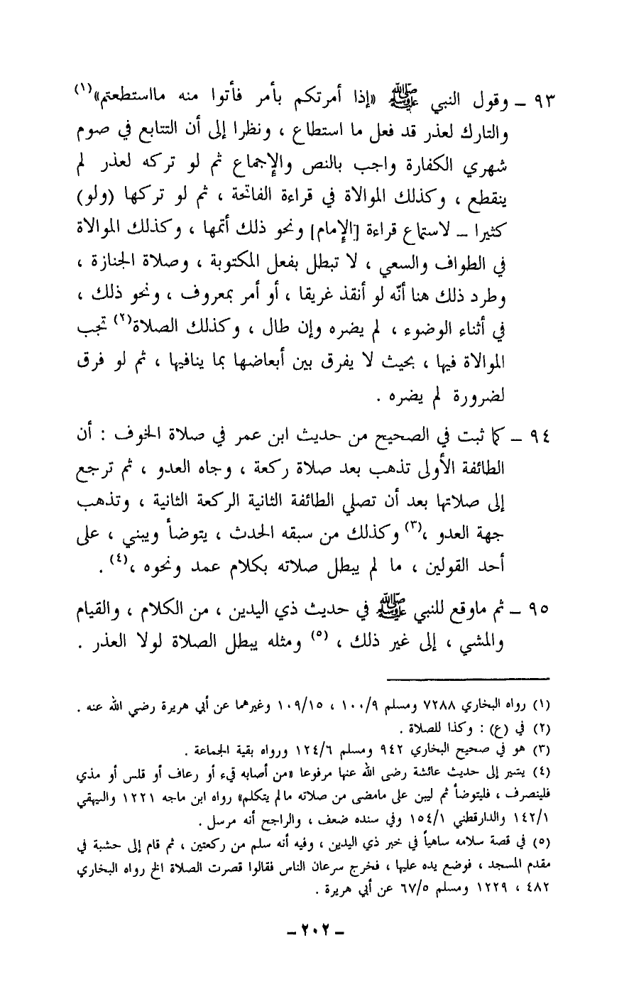 95 - ثم ما وقع للنبي - صَلَّى اللَّهُ عَلَيْهِ وَسَلَّمَ - في حديث ذي اليدين، من الكلام، والقيام والمشي، إلى غير ذلك، ومثله يبطل الصلاة لولا العذر.
