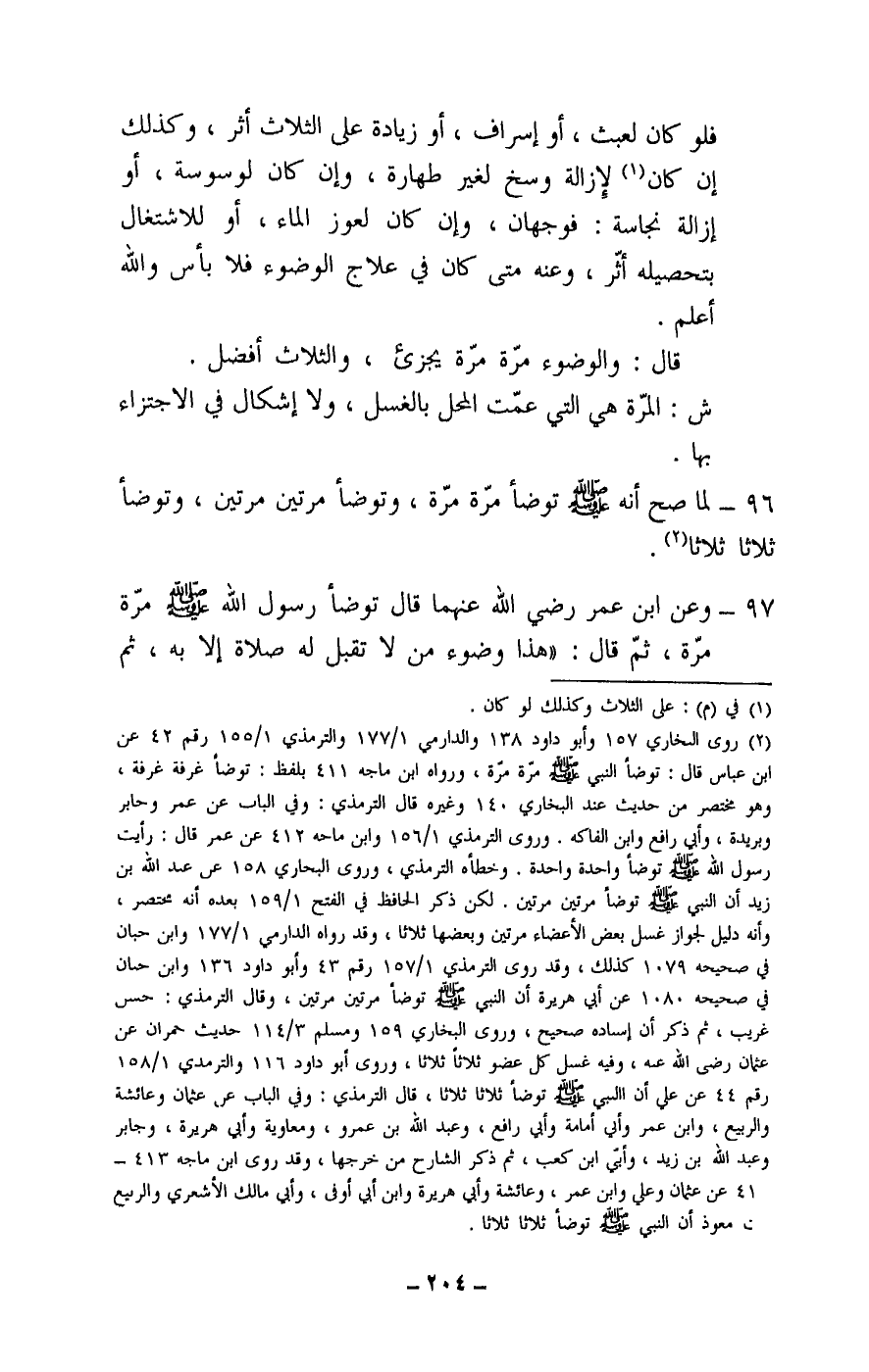 96 - لما صح أنه - صَلَّى اللَّهُ عَلَيْهِ وَسَلَّمَ - توضأ مرة مرة، وتوضأ مرتين مرتين، وتوضأ ثلاثا ثلاثا.
