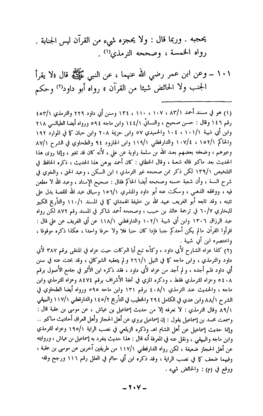 101 - وعن ابن عمر - رَضِيَ اللَّهُ عَنْهُمَا -، عن النبي - صَلَّى اللَّهُ عَلَيْهِ وَسَلَّمَ - قال: «لا يقرأ الجنب ولا الحائض شيئا من القرآن» رواه أبو داود وحكم