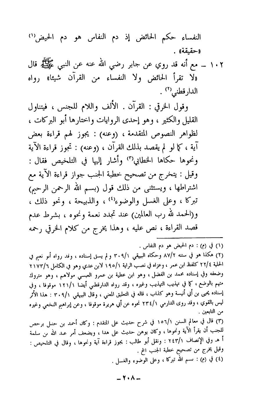 102 - مع أنه قد روي عن جابر - رَضِيَ اللَّهُ عَنْهُ - عن النبي - صَلَّى اللَّهُ عَلَيْهِ وَسَلَّمَ - قال: «لا تقرأ الحائض ولا النفساء من القرآن شيئا» رواه الدارقطني.