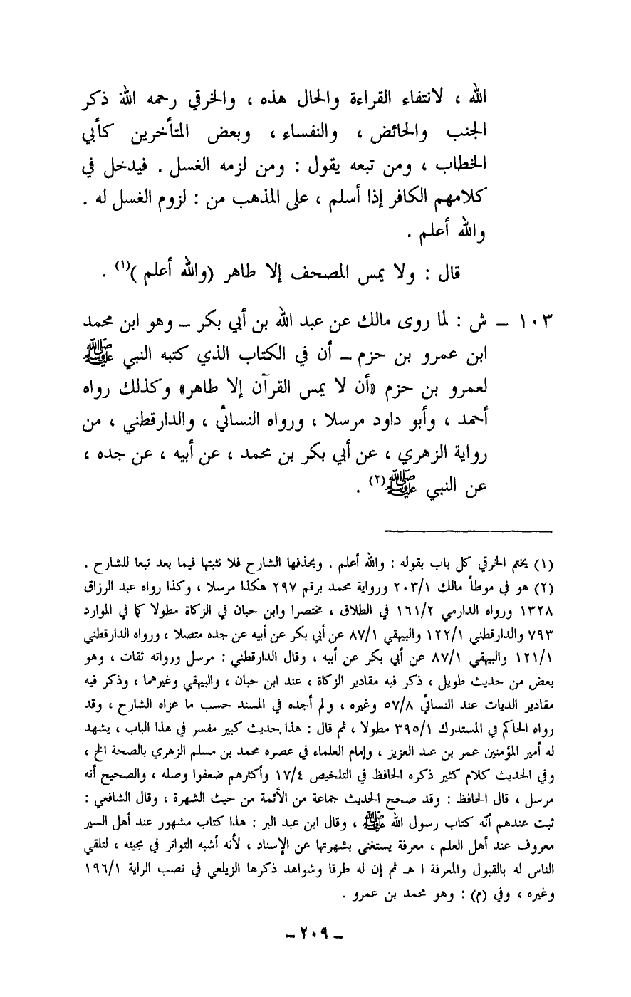 103 - ش: لما روى مالك عن عبد الله بن أبي بكر - وهو ابن محمد بن عمرو بن حزم - أن في الكتاب الذي كتبه النبي - صَلَّى اللَّهُ عَلَيْهِ وَسَلَّمَ - لعمرو بن حزم: «أن لا يمس القرآن إلا طاهر» وكذلك رواه أحمد، وأبو داود مرسلا، ورواه النسائي، والدارقطني، من رواية الزهري، عن أبي بكر بن محمد، عن أبيه، عن جده، عن النبي - صَلَّى اللَّهُ عَلَيْهِ وَسَلَّمَ -.