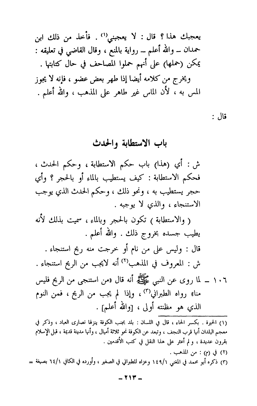 106 - لما روي عن النبي - صَلَّى اللَّهُ عَلَيْهِ وَسَلَّمَ - أنه قال: «من استنجى من الريح فليس منا» رواه الطبراني، وإذا لم يجب من الريح، فمن النوم الذي هو مظنته أولى، [والله أعلم] .