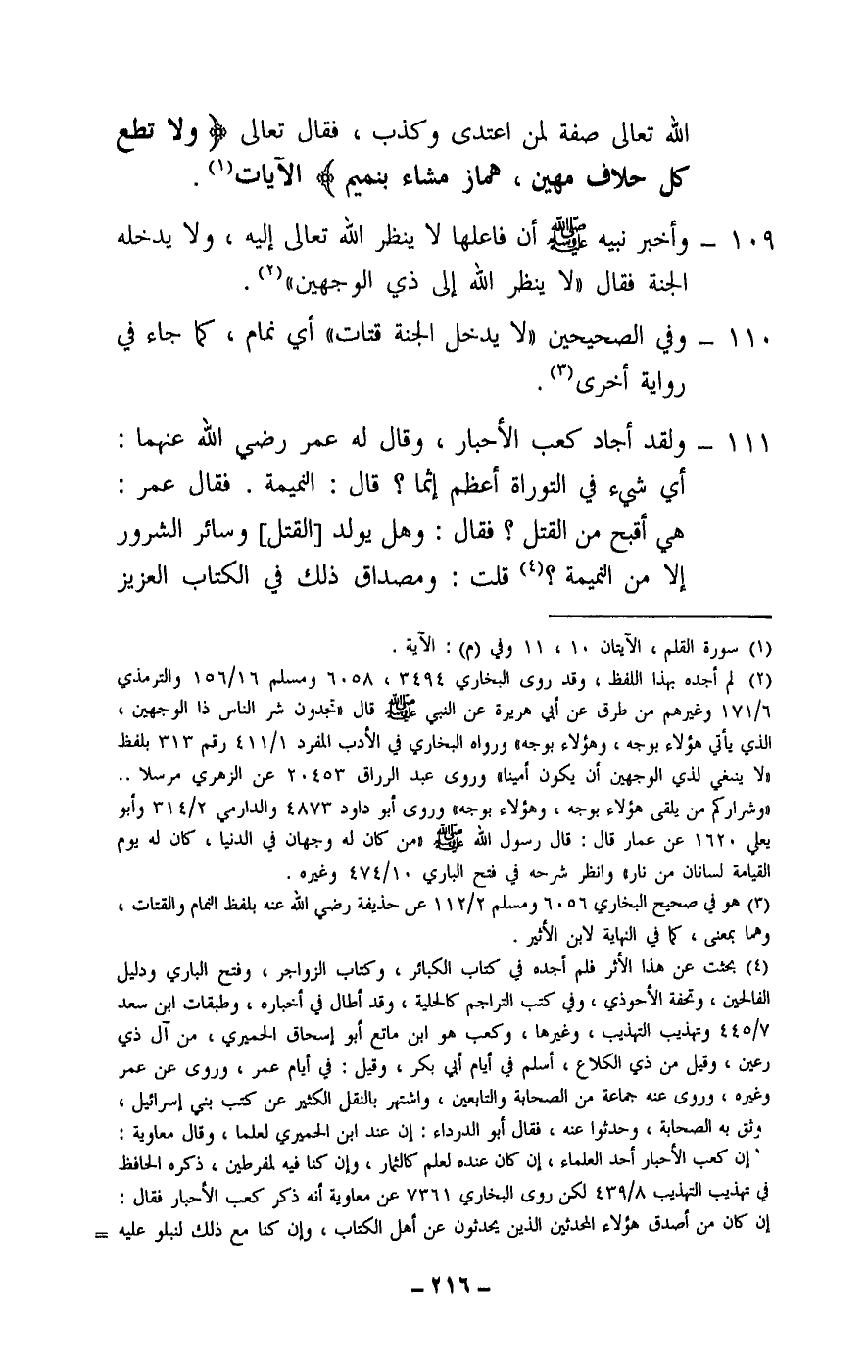 111 - ولقد أجاد كعب الأحبار، وقال له عمر - رَضِيَ اللَّهُ عَنْهُمَا -: أي شيء في التوراة أعظم إثما؟ قال: النميمة. فقال عمر: هي أقبح من القتل؟ فقال: وهل يولد [القتل] وسائر الشرور إلا من النميمة؟ قلت: ومصداق ذلك في الكتاب العزيز