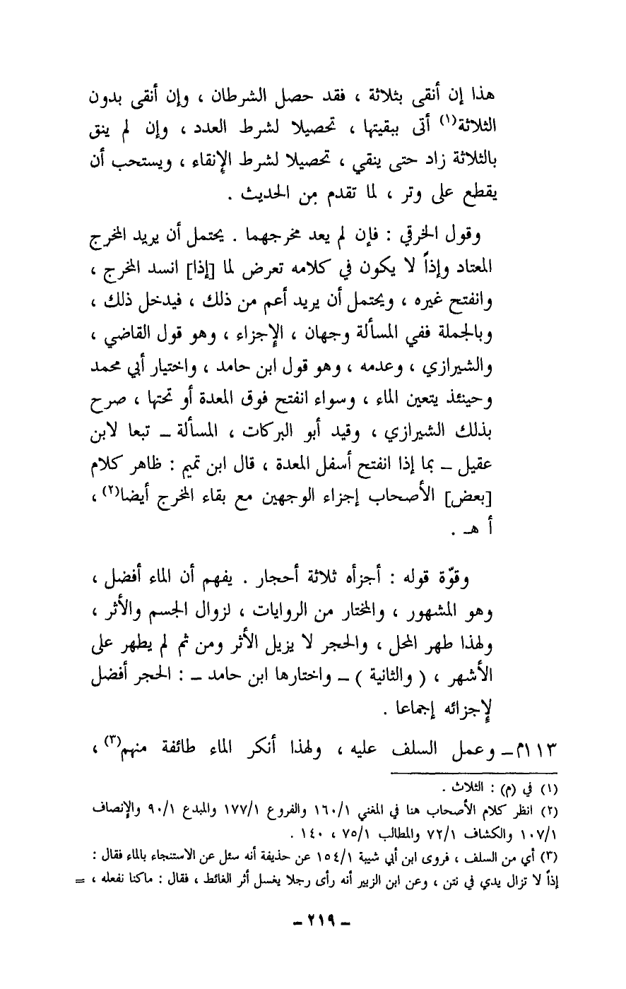 وقوة قوله: أجزأه ثلاثة أحجار. يفهم أن الماء أفضل، وهو المشهور، والمختار من الروايات، لزوال الجسم والأثر، ولهذا طهر المحل، والحجر لا يزيل الأثر ومن ثم لم يطهر على الأشهر، (والثانية) - واختارها ابن حامد -: الحجر أفضل لإجزائه إجماعا.