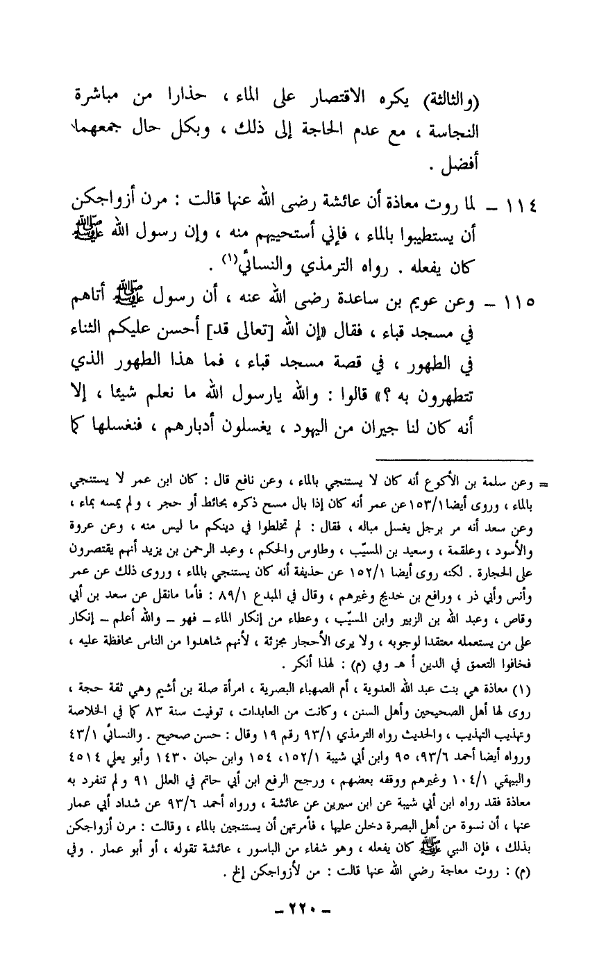 114 - لما روت معاذة «أن عائشة - رَضِيَ اللَّهُ عَنْهَا - قالت: مرن أزواجكن أن يستطيبوا بالماء، فإني أستحييهم منه، وإن رسول الله - صَلَّى اللَّهُ عَلَيْهِ وَسَلَّمَ - كان يفعله» . رواه الترمذي، والنسائي.
