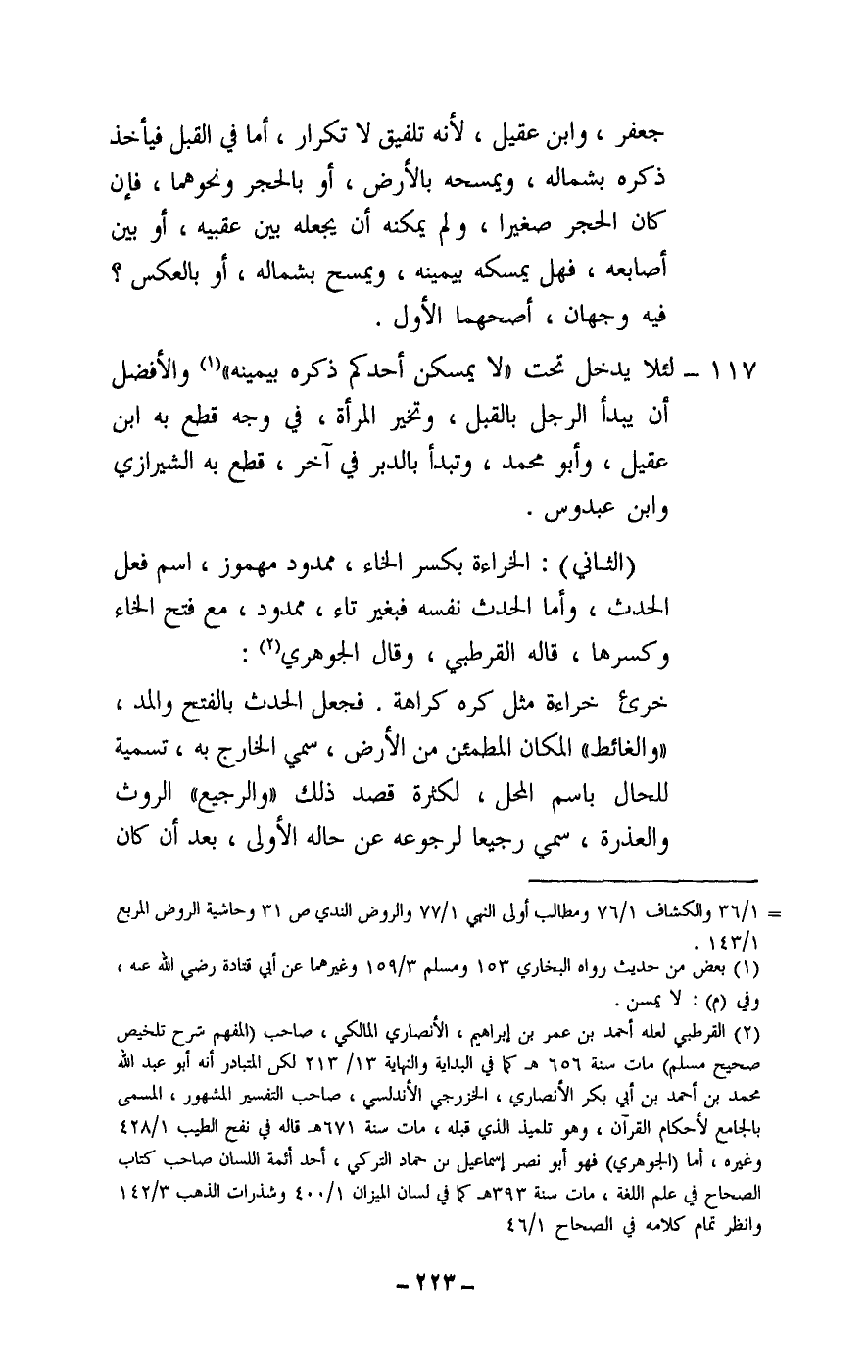 117 - لئلا يدخل تحت: «لا يمسكن أحدكم ذكره بيمينه» والأفضل أن يبدأ الرجل بالقبل، وتخير المرأة، في وجه قطع به ابن عقيل، وأبو محمد، وتبدأ بالدبر في آخر، قطع به الشيرازي وابن عبدوس.