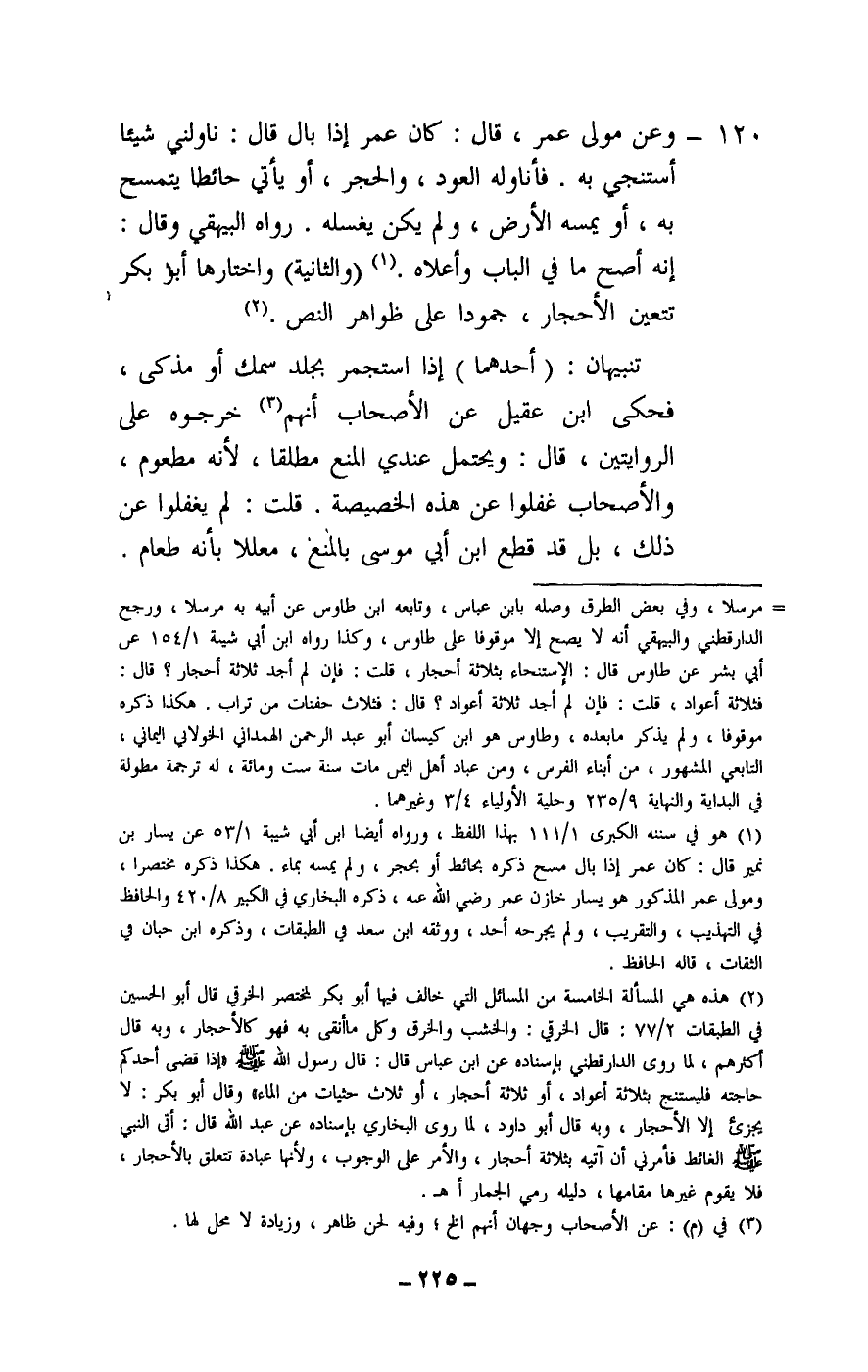 120 - وعن مولى عمر، قال: كان عمر إذا بال قال: ناولني شيئا أستنجي به. فأناوله العود، والحجر، أو يأتي حائطا يتمسح به، أو يمسه الأرض، ولم يكن يغسله. رواه البيهقي وقال: إنه أصح ما في الباب وأعلاه. (والثانية) واختارها أبو بكر: تتعين الأحجار، جمودا على ظواهر النص.