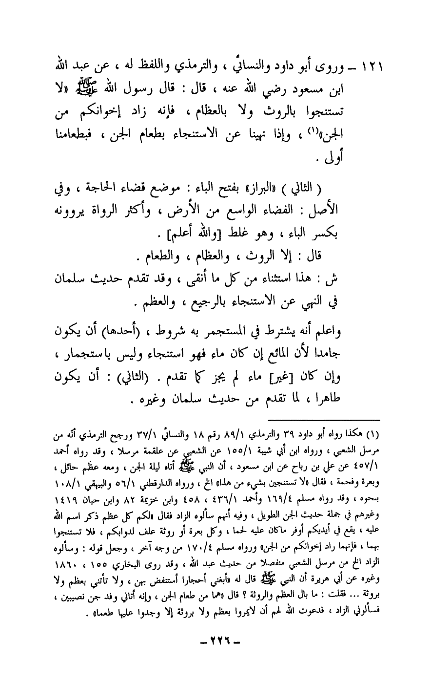 121 - وروى أبو داود والنسائي، والترمذي واللفظ له، عن عبد الله بن مسعود - رَضِيَ اللَّهُ عَنْهُ -، قال: قال رسول الله - صَلَّى اللَّهُ عَلَيْهِ وَسَلَّمَ -: «لا تستنجوا بالروث ولا بالعظام، فإنه زاد إخوانكم من الجن» » ، وإذا نهينا عن الاستنجاء بطعام الجن، فبطعامنا أولى.