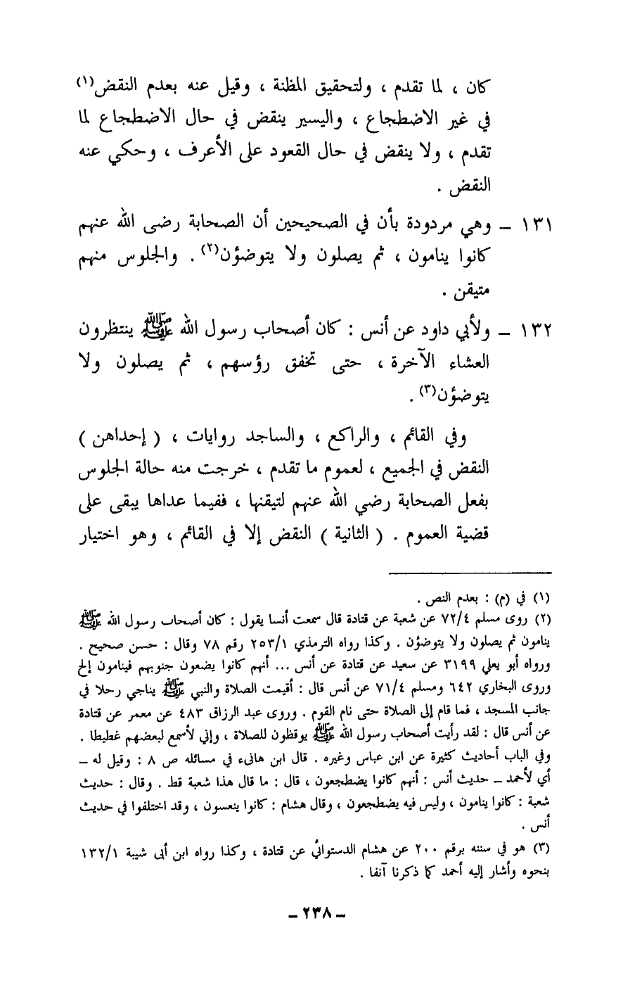 131 - وهي مردودة بأن في الصحيحين أن الصحابة - رَضِيَ اللَّهُ عَنْهُمْ - كانوا ينامون، ثم يصلون ولا يتوضئون. والجلوس منهم متيقن.