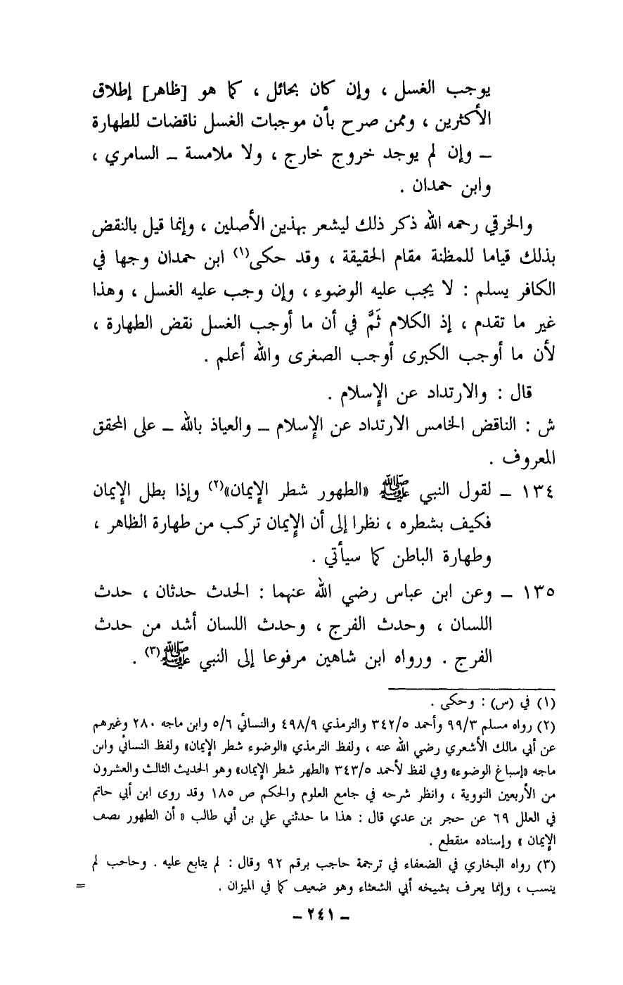 134 - لقول النبي - صَلَّى اللَّهُ عَلَيْهِ وَسَلَّمَ -: «الطهور شطر الإيمان» وإذا بطل الإيمان فكيف بشطره، نظرا إلى أن الإيمان تركب من طهارة الظاهر، وطهارة الباطن كما سيأتي.
