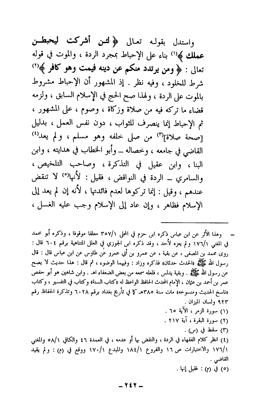 واستدل بقوله تعالى: {لَئِنْ أَشْرَكْتَ لَيَحْبَطَنَّ عَمَلُكَ} [الزمر: 65] بناء على الإحباط بمجرد الردة، والموت في قَوْله تَعَالَى: {وَمَنْ يَرْتَدِدْ مِنْكُمْ عَنْ دِينِهِ فَيَمُتْ وَهُوَ كَافِرٌ} [البقرة: 217] شرط للخلود، وفيه نظر. إذ المشهور أن الإحباط مشروط بالموت على الردة، ولهذا صح الحج في الإسلام السابق، ولزمه قضاء ما تركه فيه من صلاة وزكاة، وصوم، على المشهور، ثم الإحباط إنما ينصرف للثواب، دون نفس العمل، بدليل [صحة صلاة] من صلى خلفه وهو مسلم، ولم يعد القاضي في جامعه، وخصاله - وأبو الخطاب في هدايته، وابن البنا، وابن عقيل في التذكرة، وصاحب التلخيص، والسامري - الردة في النواقض، فقيل: لأنها لا تنقض عندهم، وقيل: إنما تركوها لعدم فائدتها، لأنه إن لم يعد إلى الإسلام فظاهر، وإن عاد إلى الإسلام وجب عليه الغسل،