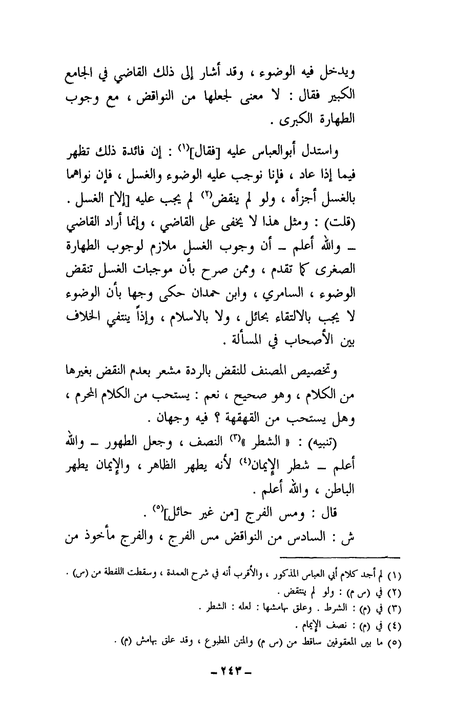 (قلت) : ومثل هذا لا يخفى على القاضي، وإنما أراد القاضي - والله أعلم - أن وجوب الغسل ملازم لوجوب الطهارة الصغرى كما تقدم، وممن صرح بأن موجبات الغسل تنقض الوضوء، السامري، وابن حمدان حكى وجها بأن الوضوء لا يجب بالالتقاء بحائل، ولا بالإسلام، وإذا ينتفي الخلاف بين الأصحاب في المسألة.