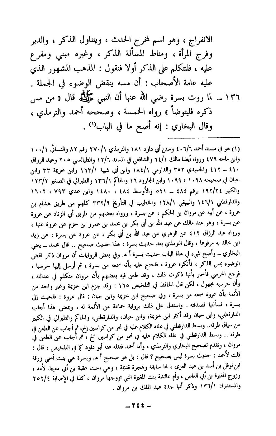 136 - لما روت بسرة - رَضِيَ اللَّهُ عَنْهَا - أن النبي - صَلَّى اللَّهُ عَلَيْهِ وَسَلَّمَ - قال: «من مس ذكره فليتوضأ» رواه الخمسة، وصححه أحمد والترمذي، وقال البخاري: إنه أصح ما في الباب.