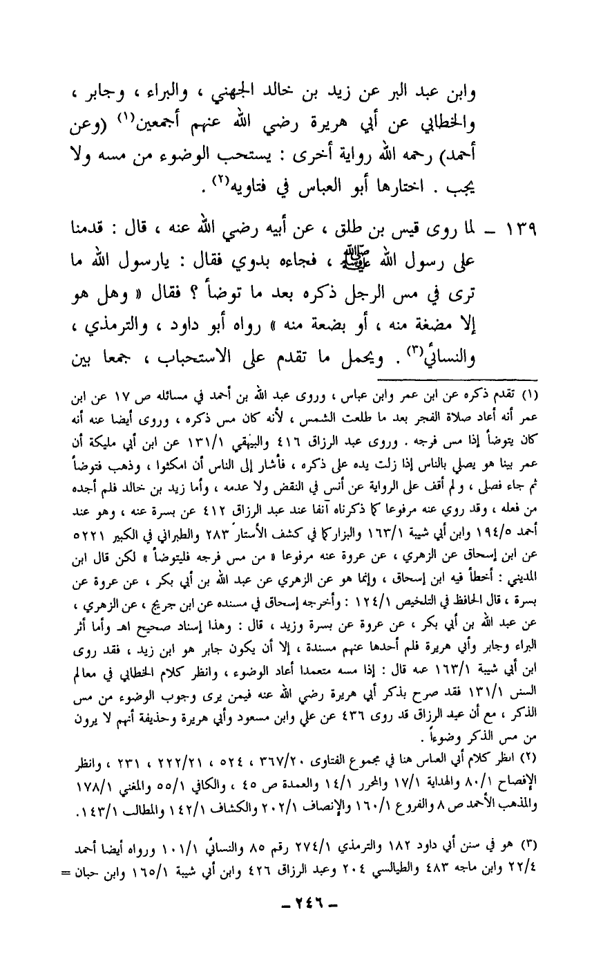 وابن عبد البر عن زيد بن خالد الجهني، والبراء، وجابر، والخطابي عن أبي هريرة - رَضِيَ اللَّهُ عَنْهُمْ أَجْمَعِينَ - (وعن أحمد) - رَحِمَهُ اللَّهُ - رواية أخرى: يستحب الوضوء من مسه ولا يجب. اختارها أبو العباس في فتاويه.