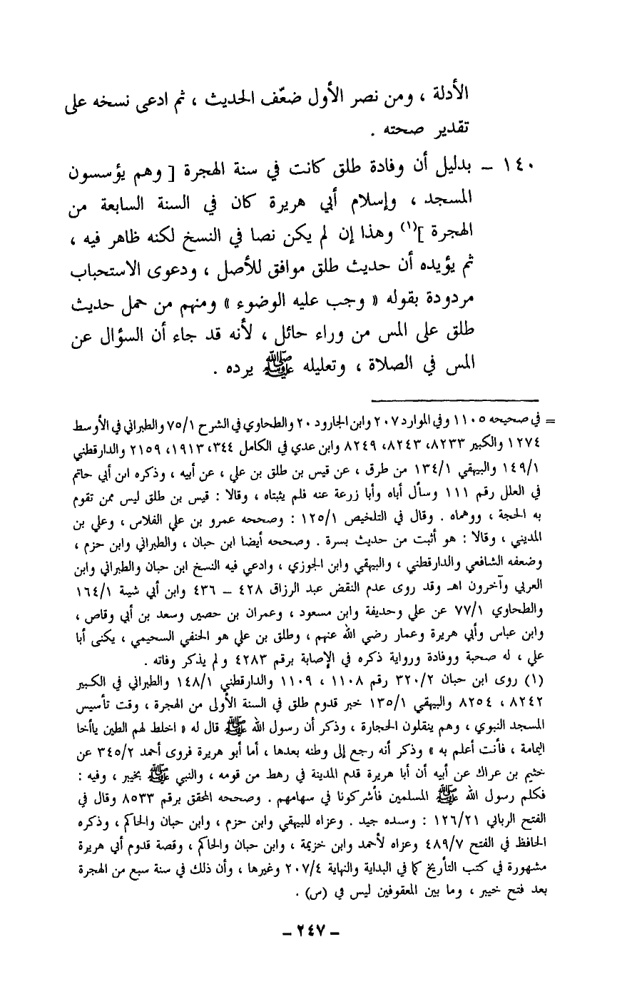 140 - بدليل أن وفادة طلق كانت في سنة الهجرة [وهم يؤسسون المسجد، وإسلام أبي هريرة كان في السنة السابعة من الهجرة] وهذا إن لم يكن نصا في النسخ لكنه ظاهر فيه، ثم يؤيده أن حديث طلق موافق للأصل، ودعوى الاستحباب مردودة بقوله: «وجب عليه الوضوء» ومنهم من حمل حديث طلق على المس من وراء حائل، لأنه قد جاء أن السؤال عن المس في الصلاة، وتعليله - صَلَّى اللَّهُ عَلَيْهِ وَسَلَّمَ - يرده.