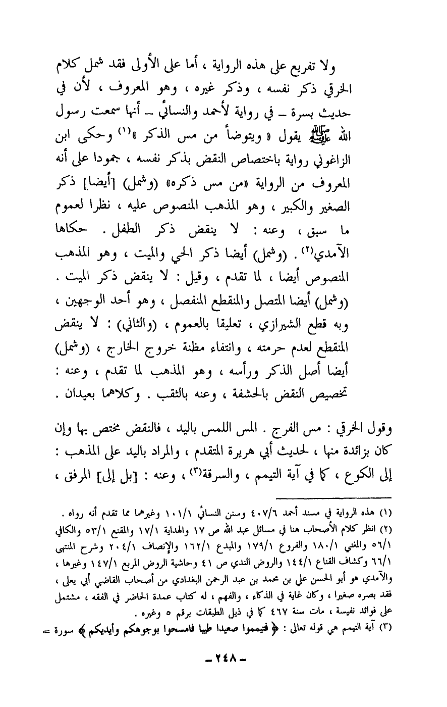 وقول الخرقي: مس الفرج. المس اللمس باليد، فالنقض مختص بها وإن كان بزائدة منها، لحديث أبي هريرة المتقدم، والمراد باليد على المذهب: إلى الكوع، كما في آية التيمم، والسرقة، وعنه: [بل إلى] المرفق،