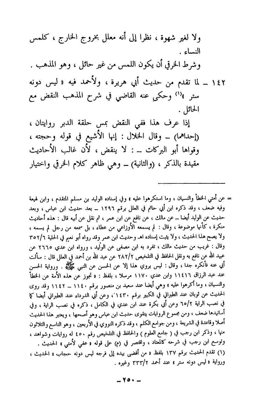 142 - لما تقدم من حديث أبي هريرة، ولأحمد فيه: «ليس دونه ستر» وحكى عنه القاضي في شرح المذهب النقض مع الحائل.