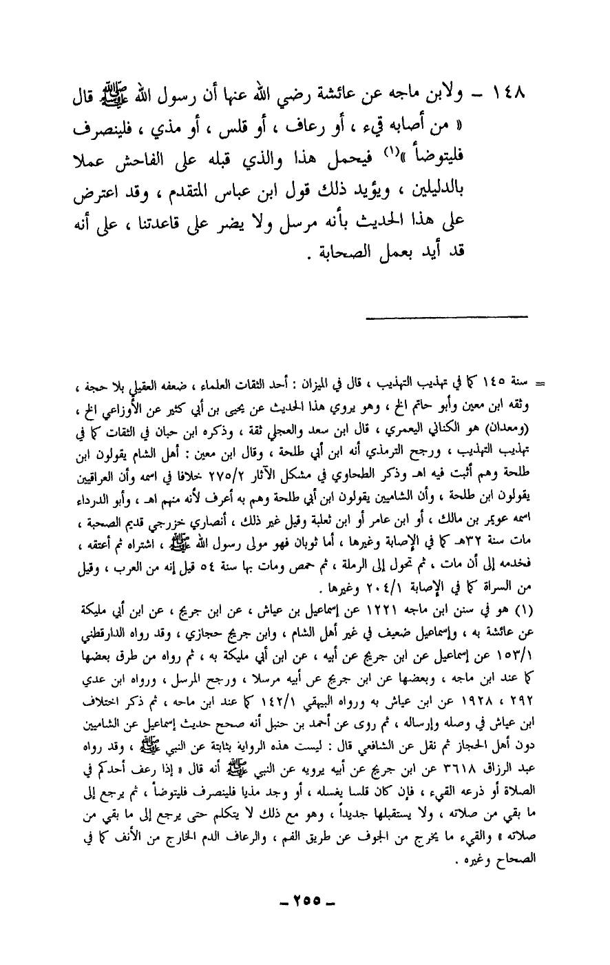 148 - ولابن ماجه عن عائشة - رَضِيَ اللَّهُ عَنْهَا - أن رسول الله - صَلَّى اللَّهُ عَلَيْهِ وَسَلَّمَ - قال: «من أصابه قيء، أو رعاف، أو قلس، أو مذي، فلينصرف فليتوضأ» فيحمل هذا والذي قبله على الفاحش عملا بالدليلين، ويؤيد ذلك قول ابن عباس المتقدم، وقد اعترض على هذا الحديث بأنه مرسل ولا يضر على قاعدتنا، على أنه قد أيد بعمل الصحابة.