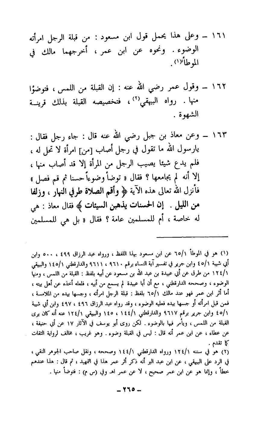 161 - وعلى هذا يحمل قول ابن مسعود: من قبلة الرجل امرأته الوضوء. ونحوه عن ابن عمر، أخرجهما مالك في الموطأ.