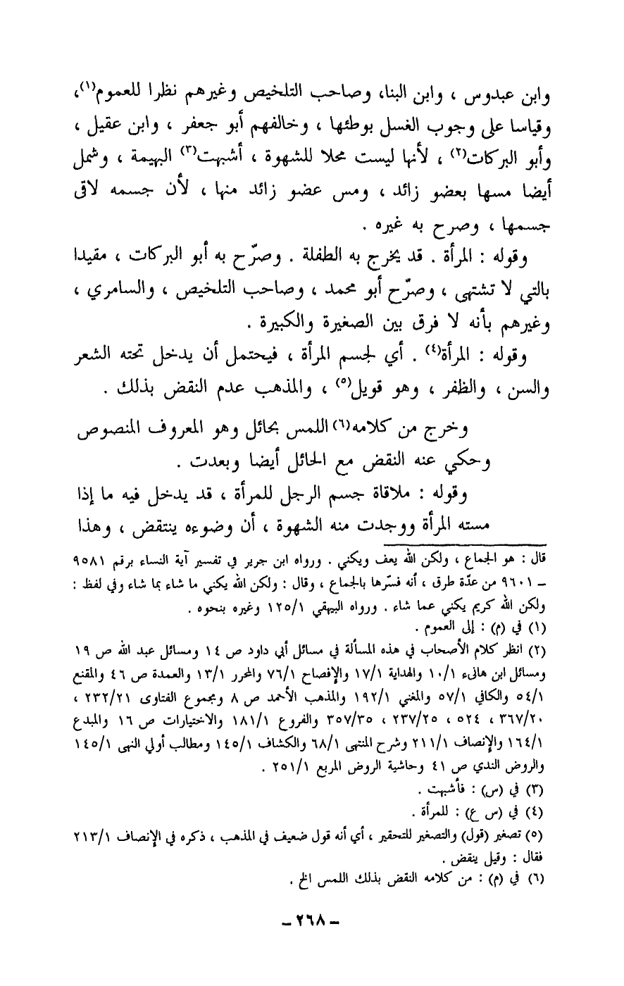 وابن عبدوس، وابن البنا، وصاحب التلخيص وغيرهم نظرا للعموم، وقياسا على وجوب الغسل بوطئها، وخالفهم أبو جعفر، وابن عقيل، وأبو البركات، لأنها ليست محلا للشهوة، أشبهت البهيمة، وشمل أيضا مسها بعضو زائد، ومس عضو زائد منها، لأن جسمه لاقى جسمها، وصرح به غيره.