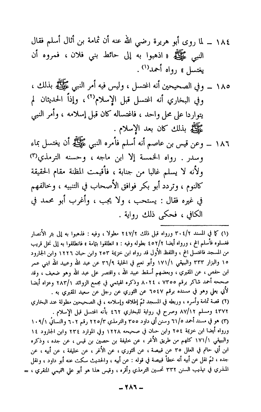 184 - لما روى أبو هريرة - رَضِيَ اللَّهُ عَنْهُ - أن ثمامة بن أثال أسلم فقال النبي - صَلَّى اللَّهُ عَلَيْهِ وَسَلَّمَ -: «اذهبوا به إلى حائط بني فلان، فمروه أن يغتسل» رواه أحمد.